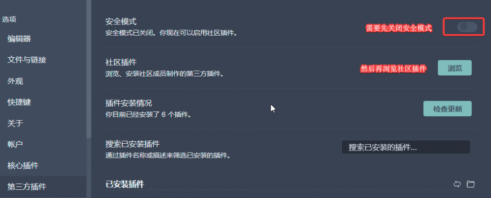 Obsidian支持丰富的第三方插件,可以扩充Obsidian功能,不过要先在设置 – 第三方插件 – 将安全模式先关闭,然后再浏览社区插件。