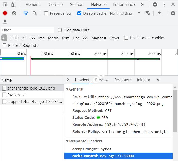 浏览器中查看Headers信息可以看到cache-control中的最大缓存时间为:31536000秒(一年),这就代表设置成功了。