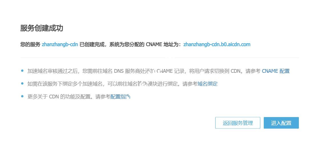 点击创建后,将得到以下提示。需要将CDN加速域名根据提示做CNAME解析,以本文为例,将cdn.veidc.com做别名解析到veidc-cdn.b0.aicdn.com,解析方法这里不做说明了。