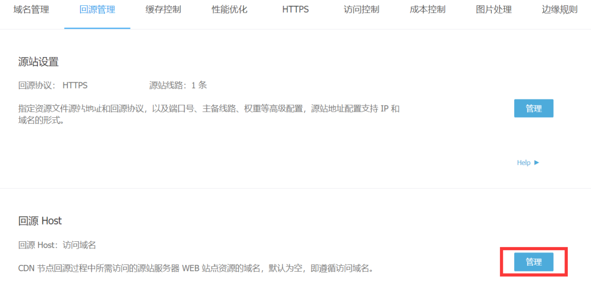 在又拍云的CDN服务管理中,先配置好回源Host,如下图: