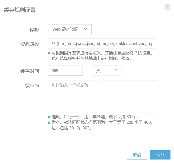 如果已经在准备工作阶段设置了网站的静态资源设置缓存时间,这里就不需要再进行设置了。在未设置缓存过期规则时,CDN 会默认遵循源站的缓存规则。