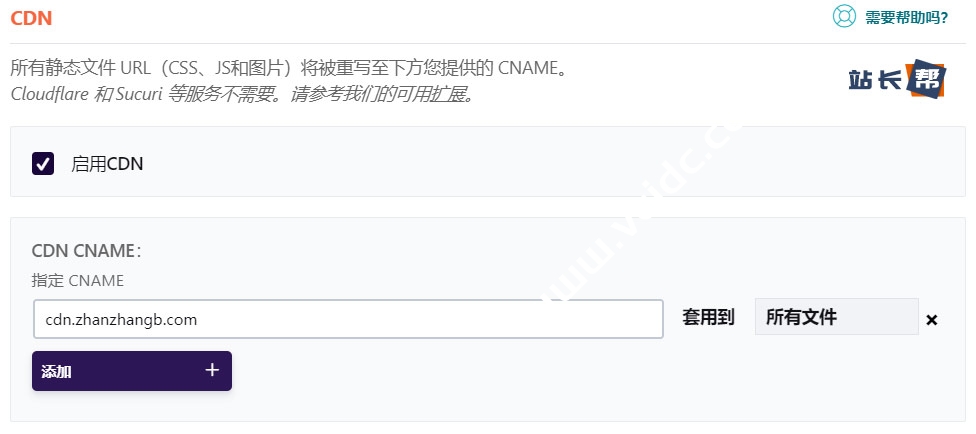 在WP Rocket插件设置中,在CDN选项里,启用CDN,并在CDN CNAME中填入配置好的CDN域名,并选中套用到所有文件,如下图: