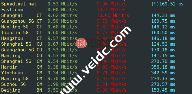 国内测速,上行和下行都是10M的带宽!