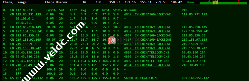 Traceroute to China, Guangzhou CU (TCP Mode, Max 30 Hop) ============================================================ traceroute to 210.21.4.130 (210.21.4.130), 30 hops max, 32 byte packets 1 10.0.146.1 0.25 ms * LAN Address 2 107.148.151.14 1.01 ms AS54600 United States, California, San Jose, petaexpress.com 3 10.255.128.28 1.20 ms * LAN Address 4 10.255.254.28 19.57 ms * LAN Address 5 218.30.49.189 10.02 ms AS4134 United States, ChinaTelecom 6 59.43.189.213 189.06 ms * China, Guangdong, Guangzhou, ChinaTelecom 7 * 8 59.43.130.153 171.42 ms * China, Guangdong, Guangzhou, ChinaTelecom 9 219.158.40.169 174.59 ms AS4837 China, Guangdong, Guangzhou, ChinaUnicom 10 219.158.103.173 172.87 ms AS4837 China, Guangdong, Guangzhou, ChinaUnicom 11 157.18.0.30 171.60 ms AS17816 China, Guangdong, Guangzhou, ChinaUnicom 12 120.80.79.194 171.05 ms AS17622 China, Guangdong, Guangzhou, ChinaUnicom 13 * 14 * Traceroute to China, Shanghai CU (TCP Mode, Max 30 Hop) ============================================================ traceroute to 58.247.8.158 (58.247.8.158), 30 hops max, 32 byte packets 1 10.0.146.1 0.19 ms * LAN Address 2 107.148.151.14 1.05 ms AS54600 United States, California, San Jose, petaexpress.com 3 10.255.128.28 1.32 ms * LAN Address 4 10.255.254.28 17.38 ms * LAN Address 5 218.30.49.189 10.38 ms AS4134 United States, ChinaTelecom 6 59.43.182.186 135.68 ms * China, Shanghai, ChinaTelecom 7 59.43.187.69 130.27 ms * China, Shanghai, ChinaTelecom 8 59.43.130.213 142.55 ms * China, Shanghai, ChinaTelecom 9 219.158.38.241 138.19 ms AS4837 China, Shanghai, ChinaUnicom 10 219.158.9.97 143.41 ms AS4837 China, Shanghai, ChinaUnicom 11 * 12 58.247.221.178 136.09 ms AS17621 China, Shanghai, ChinaUnicom 13 139.226.225.22 142.16 ms AS17621 China, Shanghai, ChinaUnicom 14 58.247.8.153 136.53 ms AS17621 China, Shanghai, ChinaUnicom 15 * 16 * Traceroute to China, Beijing CU (TCP Mode, Max 30 Hop) ============================================================ traceroute to 123.125.99.1 (123.125.99.1), 30 hops max, 32 byte packets 1 10.0.146.1 0.28 ms * LAN Address 2 107.148.151.14 1.10 ms AS54600 United States, California, San Jose, petaexpress.com 3 10.255.128.28 1.10 ms * LAN Address 4 10.255.254.28 12.36 ms * LAN Address 5 218.30.49.189 10.05 ms AS4134 United States, ChinaTelecom 6 59.43.181.157 140.76 ms * China, Shanghai, ChinaTelecom 7 59.43.187.85 140.73 ms * China, Shanghai, ChinaTelecom 8 59.43.138.69 139.98 ms * China, Shanghai, ChinaTelecom 9 202.97.70.237 140.07 ms * China, Shanghai, ChinaTelecom 10 202.97.40.45 160.24 ms AS4134 China, Beijing, ChinaTelecom 11 * 12 219.158.44.129 169.24 ms AS4837 China, Beijing, ChinaUnicom 13 * 14 61.149.203.186 158.00 ms AS4808 China, Beijing, ChinaUnicom 15 124.65.63.50 166.30 ms AS4808 China, Beijing, ChinaUnicom 16 124.65.194.138 178.28 ms AS4808 China, Beijing, ChinaUnicom 17 124.65.194.50 266.23 ms AS4808 China, Beijing, ChinaUnicom 18 * 19 123.125.99.1 172.65 ms AS4808 China, Beijing, ChinaUnicom