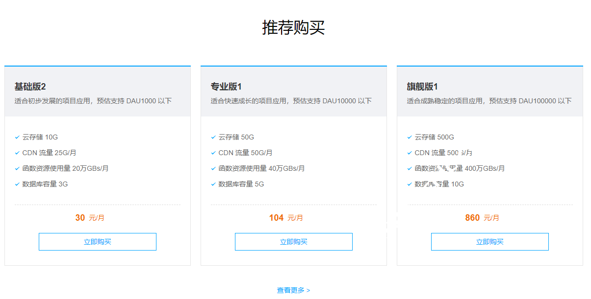 - 新用户专享云开发标准型(基础版1)套餐的活动对象:云开发用户,单个用户(同一UIN视为同一用户)均可享受免费的1个基础版1套餐;