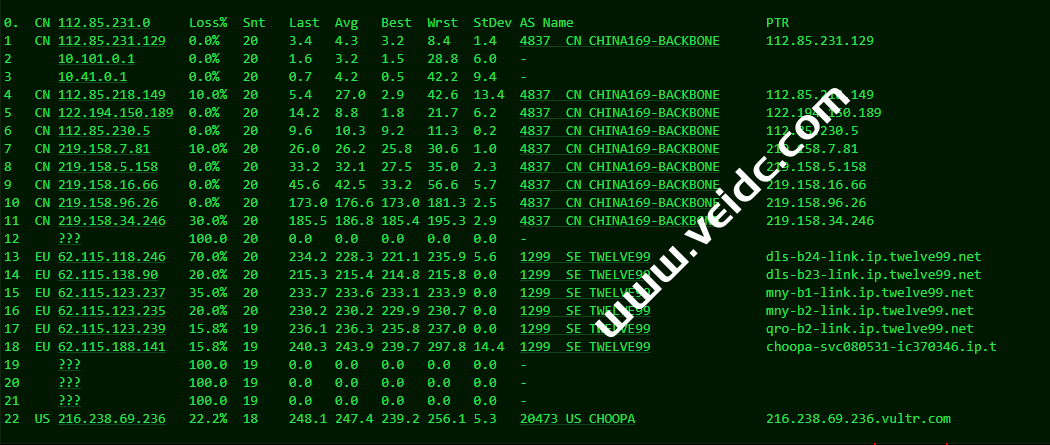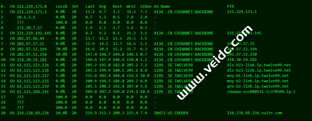 [Info] 测试路由 到 上海电信(天翼云) 中 ... traceroute to 101.227.255.45 (101.227.255.45), 30 hops max, 32 byte packets 1 * 2 * 3 * 4 * 5 qro-b2-link.ip.twelve99.net (62.115.188.140) 0.75 ms AS1299 Mexico, Queretaro, telia.com 6 mny-b2-link.ip.twelve99.net (62.115.123.238) 9.34 ms AS1299 Mexico, Nuevo Leon, Monterrey, telia.com 7 mny-b1-link.ip.twelve99.net (62.115.123.234) 9.76 ms AS1299 Mexico, Nuevo Leon, Monterrey, telia.com 8 dls-b23-link.ip.twelve99.net (62.115.123.236) 21.58 ms AS1299 United States, Texas, Dallas, telia.com 9 * 10 las-b22-link.ip.twelve99.net (62.115.143.39) 52.88 ms AS1299 United States, California, Los Angeles, telia.com 11 chinatelecom-ic-368151-las-b22.c.telia.net (62.115.185.213) 54.58 ms AS1299 United States, California, Los Angeles, telia.com 12 202.97.41.201 196.64 ms AS4134 China, Shanghai, ChinaTelecom 13 202.97.74.2 203.05 ms * China, Shanghai, ChinaTelecom 14 202.97.57.26 204.83 ms AS4134 China, Shanghai, ChinaTelecom 15 101.95.88.141 199.42 ms AS4812 China, Shanghai, ChinaTelecom 16 * 17 * 18 * 19 * 20 * 21 * 22 * 23 * 24 * 25 * 26 * 27 * 28 * 29 * 30 * [Info] 测试路由 到 上海电信(天翼云) 完成 ! [Info] 测试路由 到 厦门电信CN2 中 ... traceroute to 117.28.254.129 (117.28.254.129), 30 hops max, 32 byte packets 1 * 2 * 3 * 4 * 5 qro-b2-link.ip.twelve99.net (62.115.188.140) 0.73 ms AS1299 Mexico, Queretaro, telia.com 6 qro-b1-link.ip.twelve99.net (62.115.124.48) 6.20 ms AS1299 Mexico, Queretaro, telia.com 7 mny-b1-link.ip.twelve99.net (62.115.123.229) 12.78 ms AS1299 Mexico, Nuevo Leon, Monterrey, telia.com 8 dls-b23-link.ip.twelve99.net (62.115.123.236) 22.96 ms AS1299 United States, Texas, Dallas, telia.com 9 117.28.254.129 217.77 ms AS4809 China, Fujian, Xiamen, ChinaTelecom [Info] 测试路由 到 厦门电信CN2 完成 ! [Info] 测试路由 到 浙江杭州联通 中 ... traceroute to 101.71.241.238 (101.71.241.238), 30 hops max, 32 byte packets 1 * 2 * 3 * 4 * 5 qro-b2-link.ip.twelve99.net (62.115.188.140) 0.77 ms AS1299 Mexico, Queretaro, telia.com 6 qro-b1-link.ip.twelve99.net (62.115.124.48) 7.96 ms AS1299 Mexico, Queretaro, telia.com 7 mny-b1-link.ip.twelve99.net (62.115.123.229) 12.88 ms AS1299 Mexico, Nuevo Leon, Monterrey, telia.com 8 dls-b23-link.ip.twelve99.net (62.115.123.236) 22.92 ms AS1299 United States, Texas, Dallas, telia.com 9 dls-b24-link.ip.twelve99.net (62.115.138.91) 23.60 ms AS1299 United States, Texas, Dallas, telia.com 10 las-b2-link.ip.twelve99.net (62.115.125.163) 62.87 ms AS1299 United States, California, Los Angeles, telia.com 11 las-b2-link.ip.twelve99.net (62.115.125.163) 54.08 ms AS1299 United States, California, Los Angeles, telia.com 12 chinaunicom-ic302366-las-bb1.ip.twelve99-cust.net (62.115.33.230) 75.60 ms AS1299 United States, California, Los Angeles, telia.com 13 219.158.98.17 217.75 ms AS4837 China, Beijing, ChinaUnicom 14 219.158.5.198 238.39 ms AS4837 China, Shanghai, ChinaUnicom 15 219.158.113.134 243.06 ms AS4837 China, Shanghai, ChinaUnicom 16 219.158.113.105 237.49 ms AS4837 China, Shanghai, ChinaUnicom 17 219.158.115.146 248.63 ms AS4837 China, Zhejiang, Hangzhou, ChinaUnicom 18 101.71.244.90 248.06 ms AS4837 China, Zhejiang, Hangzhou, ChinaUnicom 19 * 20 * 21 * 22 * 23 * 24 * 25 * 26 * 27 * 28 * 29 * 30 * [Info] 测试路由 到 浙江杭州联通 完成 ! [Info] 测试路由 到 浙江杭州移动 中 ... traceroute to 112.17.0.106 (112.17.0.106), 30 hops max, 32 byte packets 1 * 2 * 3 * 4 * 5 qro-b2-link.ip.twelve99.net (62.115.188.140) 0.88 ms AS1299 Mexico, Queretaro, telia.com 6 mny-b2-link.ip.twelve99.net (62.115.123.238) 9.22 ms AS1299 Mexico, Nuevo Leon, Monterrey, telia.com 7 mdc-b1-link.ip.twelve99.net (62.115.124.12) 13.22 ms AS1299 United States, Texas, McAllen, telia.com 8 hou-b1-link.ip.twelve99.net (62.115.114.254) 21.56 ms AS1299 United States, Texas, Houston, telia.com 9 atl-b24-link.ip.twelve99.net (62.115.116.47) 35.01 ms AS1299 United States, Georgia, Atlanta, telia.com 10 ash-bb2-link.ip.twelve99.net (62.115.125.129) 48.91 ms AS1299 United States, Virginia, Ashburn, telia.com 11 nyk-bb2-link.ip.twelve99.net (62.115.136.200) 125.14 ms AS1299 United States, New York, New York City, telia.com 12 ldn-bb1-link.ip.twelve99.net (62.115.113.21) 124.57 ms AS1299 United Kingdom, London, telia.com 13 slou-b1-link.ip.twelve99.net (62.115.117.193) 152.35 ms AS1299 United Kingdom, Berkshire County, Slough, telia.com 14 chinamobile-ic342125-slou-b1.ip.twelve99-cust.net (62.115.171.223) 133.70 ms AS1299 United Kingdom, Berkshire County, Slough, telia.com 15 223.120.10.197 125.37 ms AS58453 United Kingdom, London, ChinaMobile 16 223.120.15.38 299.50 ms AS58453 China, ChinaMobile 17 221.183.55.30 302.94 ms AS9808 China, Shanghai, ChinaMobile 18 221.183.25.189 300.33 ms AS9808 China, Shanghai, ChinaMobile 19 221.176.22.9 300.89 ms AS9808 China, Shanghai, ChinaMobile 20 111.24.3.85 361.47 ms AS9808 China, Shanghai, ChinaMobile 21 221.183.108.122 311.79 ms AS9808 China, Zhejiang, Hangzhou, ChinaMobile 22 * 23 218.205.58.190 313.20 ms AS56041 China, Zhejiang, Hangzhou, ChinaMobile 24 218.205.87.13 318.23 ms AS56041 China, Zhejiang, Hangzhou, ChinaMobile 25 * 26 * 27 * 28 * 29 * 30 * [Info] 测试路由 到 浙江杭州移动 完成 ! [Info] 测试路由 到 北京教育网 中 ... traceroute to 202.205.6.30 (202.205.6.30), 30 hops max, 32 byte packets 1 * 2 * 3 * 4 * 5 qro-b2-link.ip.twelve99.net (62.115.188.140) 1.05 ms AS1299 Mexico, Queretaro, telia.com 6 qro-b1-link.ip.twelve99.net (62.115.124.48) 1.24 ms AS1299 Mexico, Queretaro, telia.com 7 mny-b1-link.ip.twelve99.net (62.115.123.229) 12.66 ms AS1299 Mexico, Nuevo Leon, Monterrey, telia.com 8 dls-b23-link.ip.twelve99.net (62.115.123.236) 22.94 ms AS1299 United States, Texas, Dallas, telia.com 9 las-b23-link.ip.twelve99.net (62.115.123.137) 54.22 ms AS1299 United States, California, Los Angeles, telia.com 10 telstra-svc071036-lag000214.ip.twelve99-cust.net (213.248.92.107) 53.30 ms AS1299 United States, California