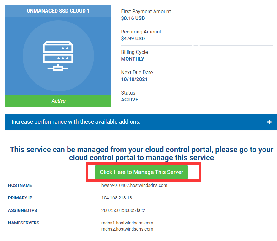 登录之后,可以看到我们已经购买的 VPS ,点击想更换 IP 的 VPS 后面的 Manage 按钮,如图所示: