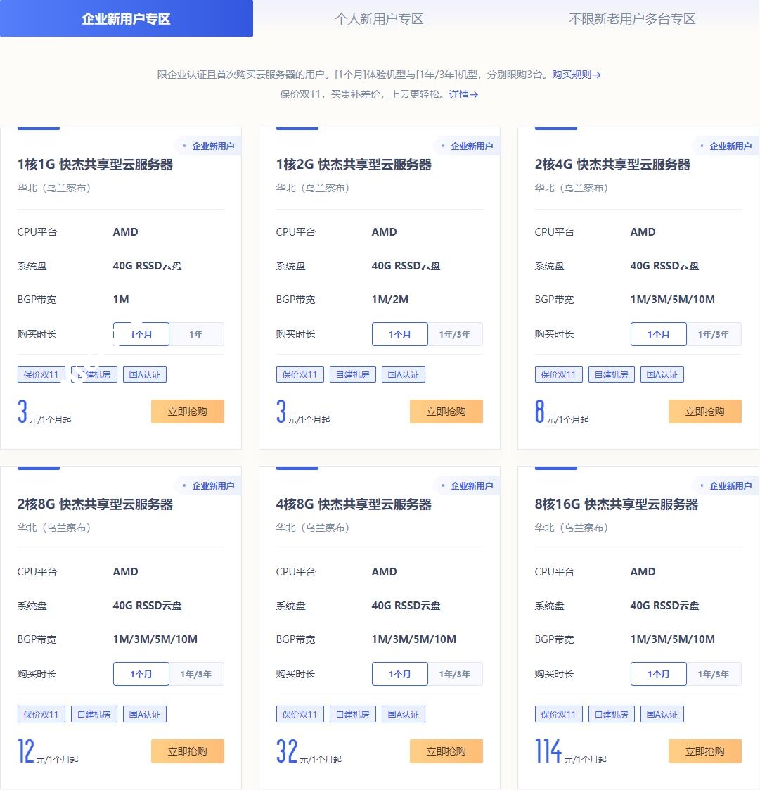 昨天,UCloud金秋狂欢盛典暨乌兰察布上新首促活动上线了,内蒙古乌兰察布快杰共享型云服务器1核1G低至3元/1个月或37元/年(企业新用户),低至3元/1个月或44元/年(个人新用户)。企业新用户[1个月]体验机型与[1年/3年]机型,分别限购3台;个人新用户分别限购1台。