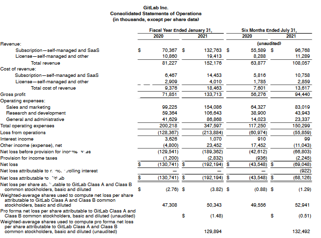 招股书显示,在报告期内GitLab营收8122.7万美元、1.52亿美元,同比增长了87%。不过净亏损也由1.307亿美元扩大至1.922亿美元,毛利率则维持在88%。