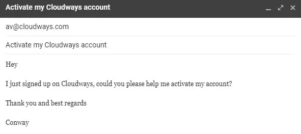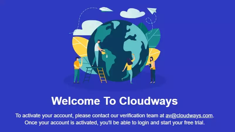 提交注册信息之后,会出现如下图提示,要激活你的账户,需要使用你的注册邮箱给 av@cloudways.com 发送一封申请激活账户的邮件。这样做的主要目的是防止有人恶意注册和使用 Cloudways 提供的服务。