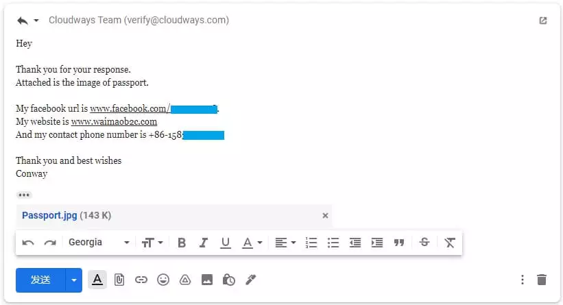 按照要求,我提供了护照,Facebook,网站链接,以及我的手机号码。邮件内容如下。
