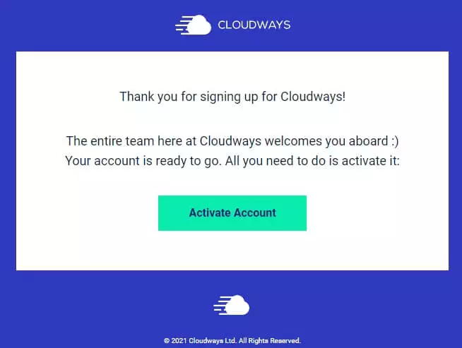 另外,我在收到这个激活邮件的同时,还收到 Cloudways 发来的另外一封邮件,问我网站的月访问量情况,想要换主机服务商的原因等等问题: Hi there, I need to collect some information from your end so I can activate your account: 1) Monthly page views? 2) Nature of your website? 3) Your last hosting provider and pain point if any? 我判断这封邮件只是个调查邮件,并且因为已经有了下面的激活链接,所以,我没有再回复这封邮件。目前账户正常使用中。