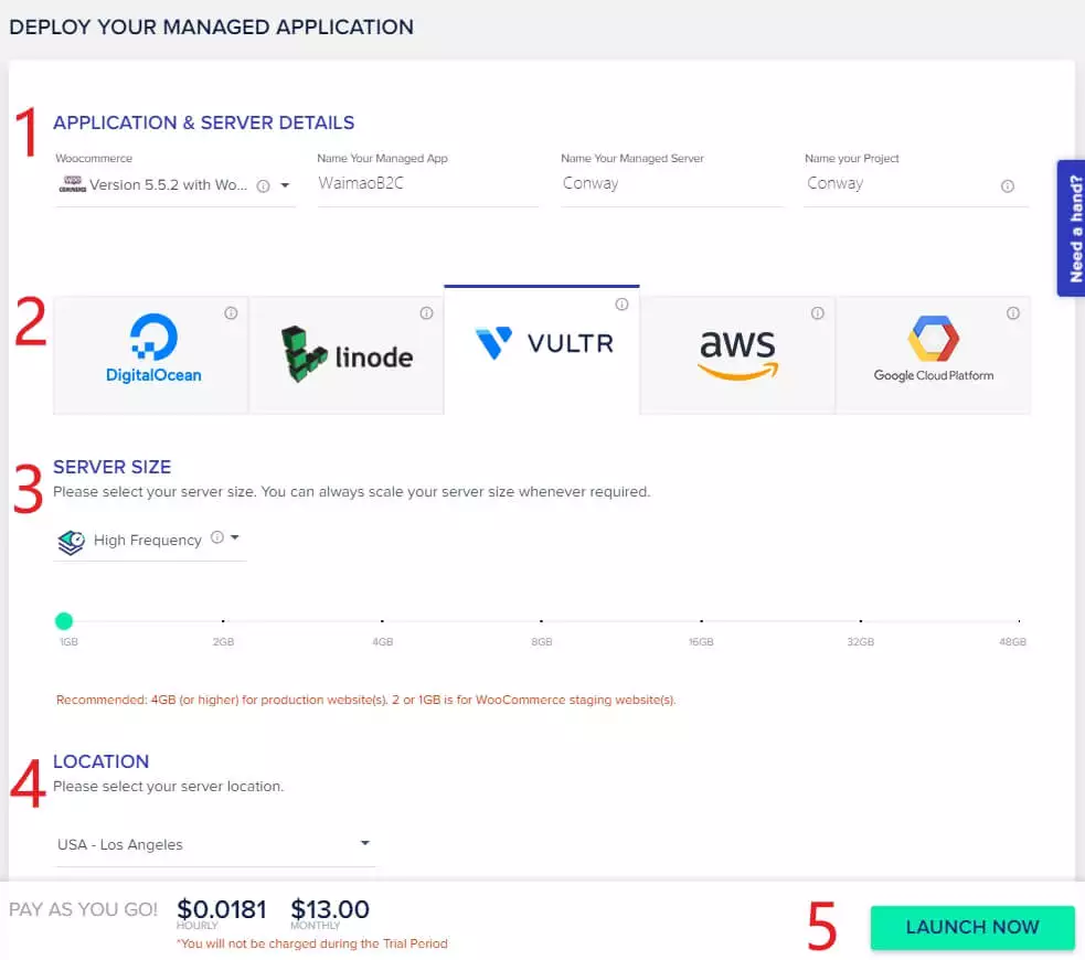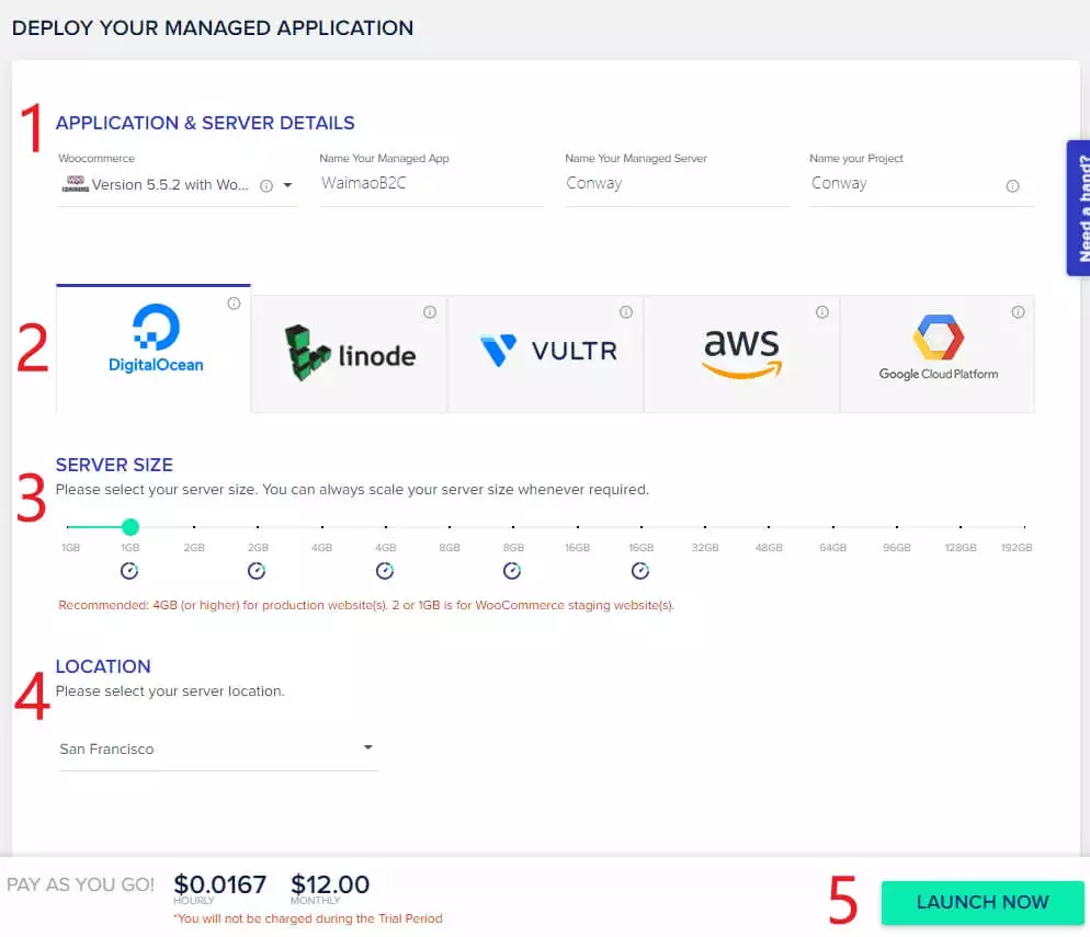 最后,点击页面右下角的 LAUNCH NOW 按钮,Cloudways 就开始按照你的设置配置服务器,并且在服务器上安装你选定的程序,如 WooCommerce.