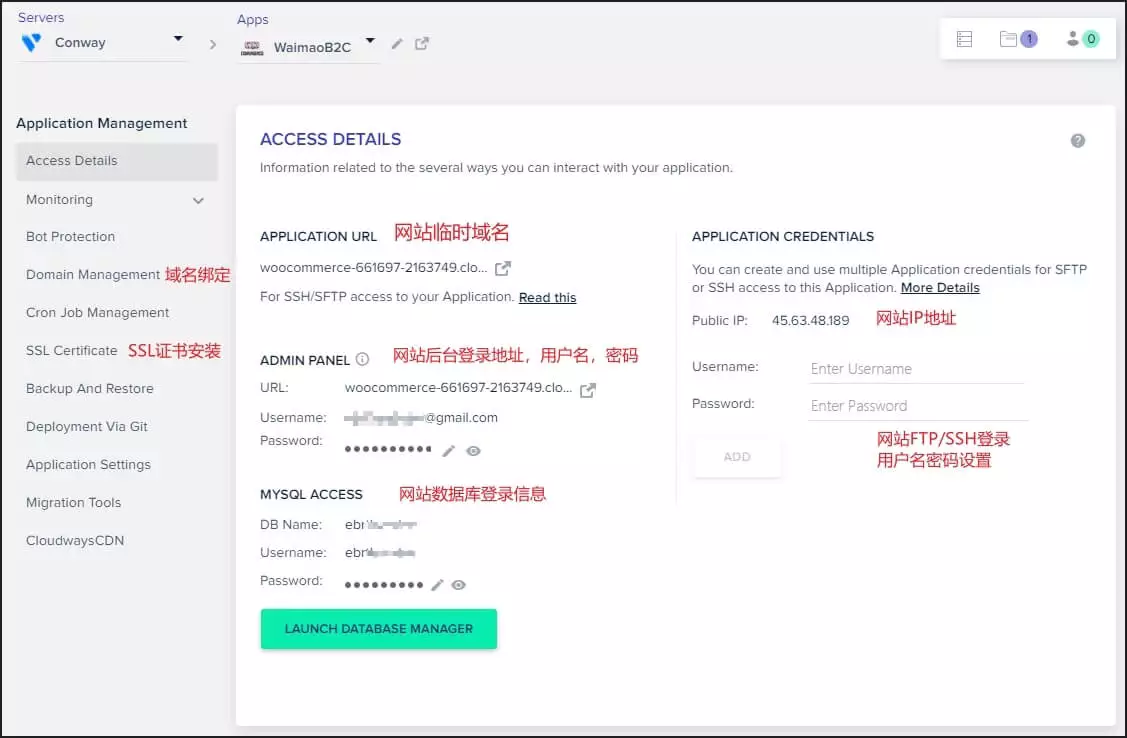 如下图是网站临时域名,网站后台登录信息,数据库登录信息,FTP/SSH设置选项,以及网站IP地址等等信息。这里请先重点关注网站IP地址 Public IP,我们在接下来的域名解析操作过程中会用到这个IP地址。因为IP地址是随机分配的,所以每个网站分配到的IP地址都是不同的,我的 WooCommerce 网站分配到的 IP 地址是 45.63.48.189。