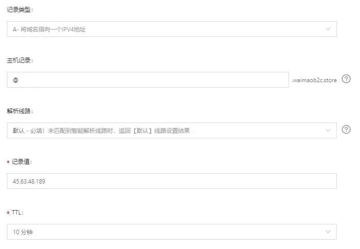然后再添加另外一条解析记录,除了主机记录值由 @ 改为 www 之外,其他和上面添加设置的解析记录保持一致。( 我的网站域名是 waimaob2c.store。主机记录为 @,代表的含义是用户可以直接通过 waimaob2c.store 这个域名访问到我的网站;主机记录为 www,代表的含义则是用户可以直接通过 www.waimaob2c.store 这个域名访问到我的网站。如果不添加 www 这条解析记录的话,用户是无法通过 www.waimaob2c.store 这个域名打开网站的)