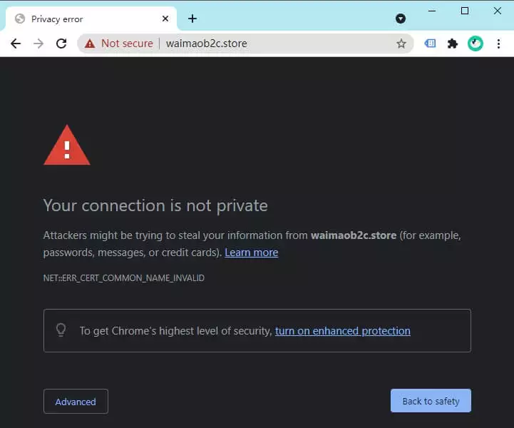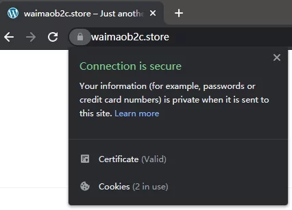 例如我设置的 Primary Domain 为 waimaob2c.com,那么我在测试的时候,就在浏览器输入 http://www.waimaob2c.store, 然后回车,看是否会正常跳转到 https://waimaob2c.store. 如果你的测试和我一样,正常跳转,并且有小锁子,则说明网站域名解析以及SSL证书的安装是没有任何问题的。