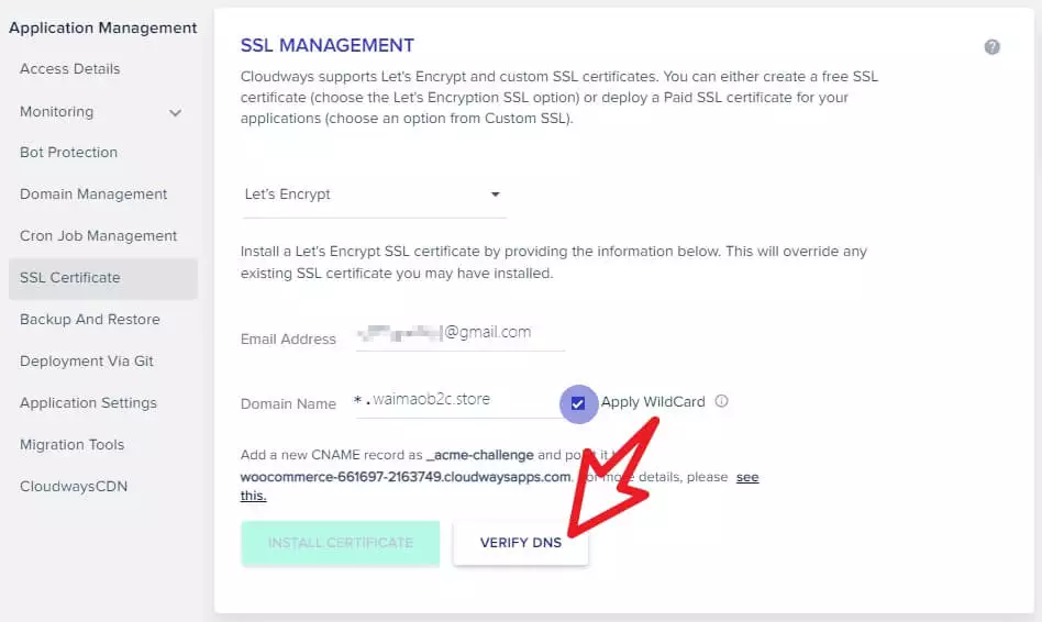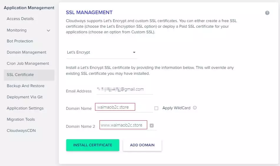 在 SSL Certificate 页面,证书类型选择免费的 Let’s Encrypt 就可以,如果你的网站有买过其他SSL证书,可以选择 Custom SSL,然后按照引导一步步安装证书到 Cloudways 服务器上。这里推荐安装 Let’s Encrypt 证书。邮箱地址随意,不要求和注册账户的邮箱一致。