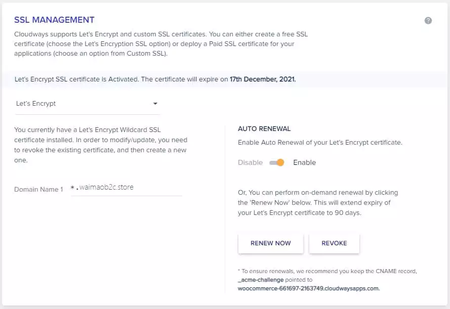 完成解析记录的添加之后,回到 Cloudways 后台安装SSL证书的页面,点击底部的 VERIFY DNS 按钮。如果解析记录添加无误的话,就会在页面右上角出现文字提示: Your domain DNS has been verified. Please continue with certificate installation. 同时,在页面中会显示 SSL certificate is Activated,表示 SSL 证书成功安装,且证书的过期日期为 2021年的12月17日。也就是说,证书有效期为3个月。不过不用担心,证书到期后会自动更新。所以,请保证证书的 AUTO RENEWAL 处于 Enable 的状态。