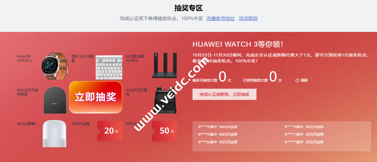 如果我们认证和消费还可以得到抽奖奖励,100%中奖最高可以得到路由器、机械键盘或者手表等。当然,如果我们消费金额满足一定,可以得到满送的实物奖励。一般我们有很多企业采购会用到华为云的产品比较多,毕竟企业生态的有很多是用到华为的设备和软件。