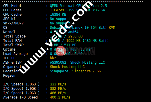 cpu:1 Cores 3199.996 MHz x86_64,磁盘io:400.3 MB/s,这io还可以。