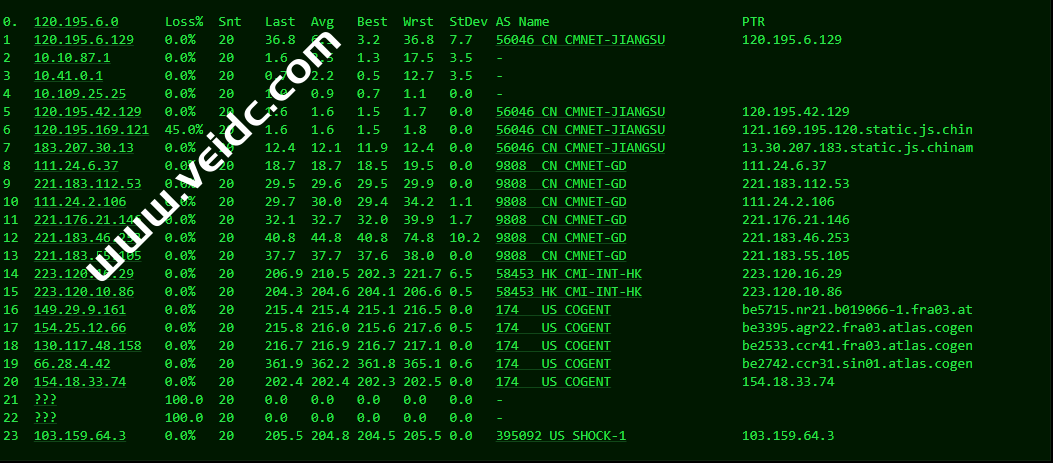 Traceroute to China, Guangzhou CU (TCP Mode, Max 30 Hop) ============================================================ traceroute to 210.21.4.130 (210.21.4.130), 30 hops max, 32 byte packets 1 * 2 103.216.223.129 0.70 ms AS136557 Singapore, hostuniversal.com.au 3 103.216.223.85 0.18 ms AS136557 Singapore, hostuniversal.com.au 4 156.146.32.96 1.11 ms AS60068 cdn77.com 5 * 6 129.250.4.133 1.29 ms AS2914 Singapore, ntt.com 7 129.250.2.243 67.46 ms AS2914 Japan, Tokyo, ntt.com 8 * 9 * 10 * 11 * 12 * Traceroute to China, Shanghai CU (TCP Mode, Max 30 Hop) ============================================================ traceroute to 58.247.8.158 (58.247.8.158), 30 hops max, 32 byte packets 1 * 2 103.216.223.129 0.68 ms AS136557 Singapore, hostuniversal.com.au 3 103.216.223.85 0.58 ms AS136557 Singapore, hostuniversal.com.au 4 156.146.32.96 0.96 ms AS60068 cdn77.com 5 * 6 * 7 129.250.2.67 67.75 ms AS2914 Japan, Osaka, ntt.com 8 * 9 * 10 * 11 * 12 * 13 58.247.221.178 292.66 ms AS17621 China, Shanghai, ChinaUnicom 14 139.226.225.22 139.92 ms AS17621 China, Shanghai, ChinaUnicom 15 * 16 * 17 * 18 * Traceroute to China, Beijing CU (TCP Mode, Max 30 Hop) ============================================================ traceroute to 123.125.99.1 (123.125.99.1), 30 hops max, 32 byte packets 1 * 2 103.216.223.129 0.65 ms AS136557 Singapore, hostuniversal.com.au 3 103.216.223.85 0.18 ms AS136557 Singapore, hostuniversal.com.au 4 156.146.32.96 1.02 ms AS60068 cdn77.com 5 * 6 129.250.2.96 2.69 ms AS2914 Singapore, ntt.com 7 129.250.2.67 65.40 ms AS2914 Japan, Osaka, ntt.com 8 * 9 * 10 * 11 * 12 * 13 219.232.11.134 175.69 ms AS4808 China, Beijing, ChinaUnicom 14 124.65.194.134 167.23 ms AS4808 China, Beijing, ChinaUnicom 15 * 16 * 17 123.125.99.1 157.78 ms AS4808 China, Beijing, ChinaUnicom