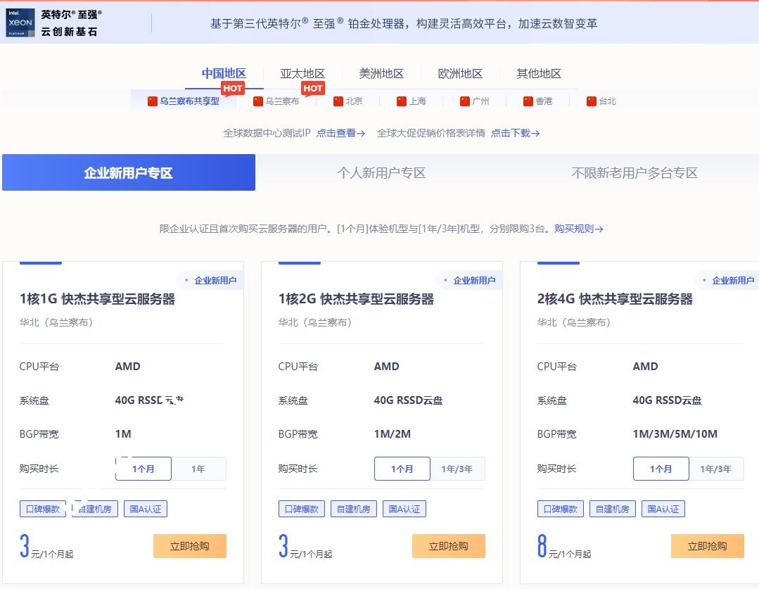 注:本活动有效期截止至2021年12月31日,中国地区-企业新用户限购3台,个人新用户限购1台;乌兰察布共享型为CPU共享,IP独享;快杰型云服务器为UCloud旗舰产品,性能优秀!