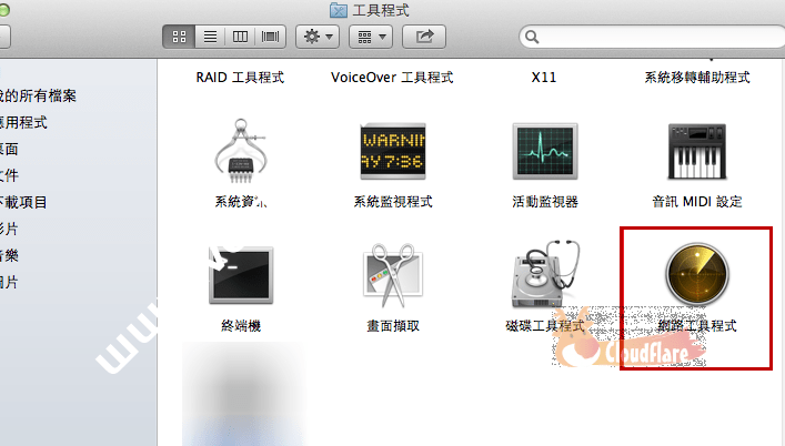 首先于MAC桌面上找到“前往”下拉选单里的工具程式,点此进入会看到”网路工具程式“。