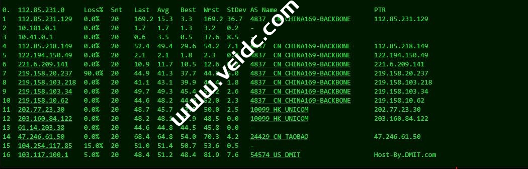联通回程, 走AS10099+ AS4837的高端线路,直连。