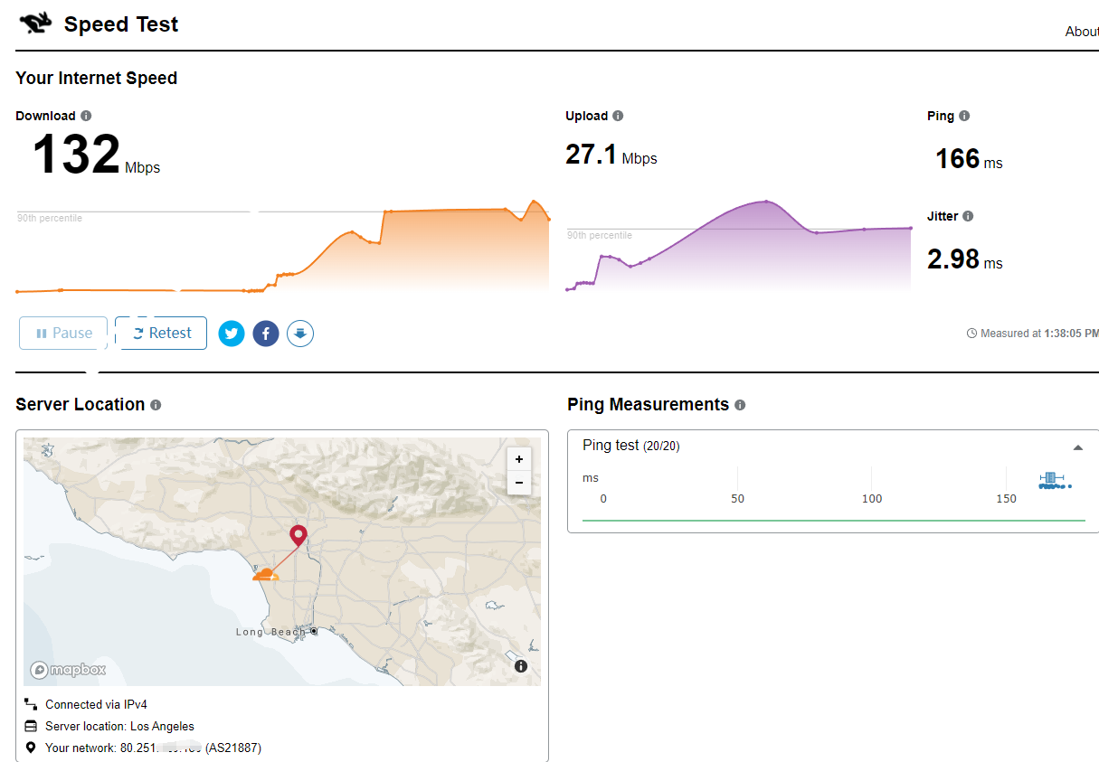 The measurements run on the Cloudflare network, which spans data centers in over 200+ cities worldwide. This ensures you are testing against a server that is close to you, which means you are measuring only the speed of your ISP, with minimal networks in between that may impact your score.