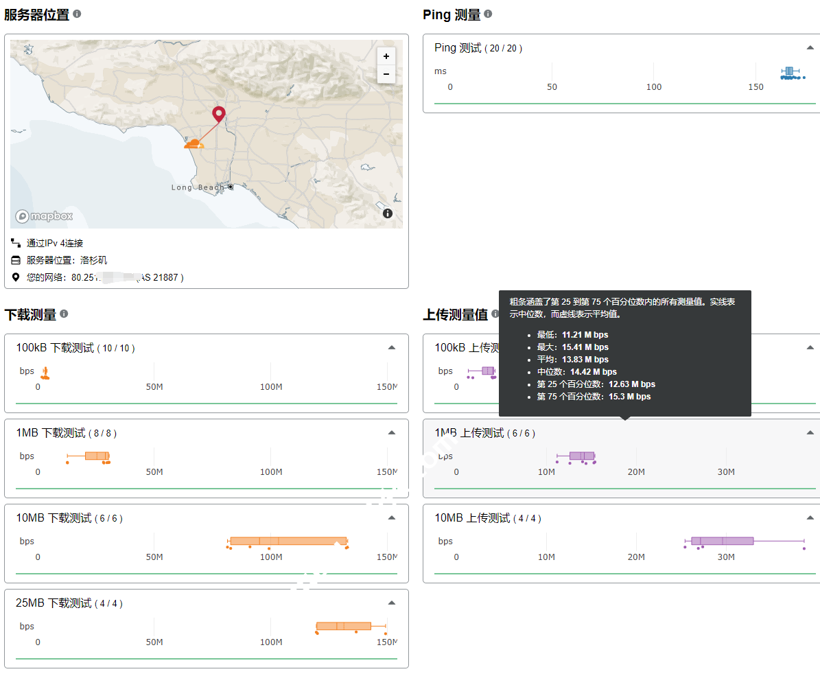 对于每种大小的文件的测试结果,点击之后会展示每次的具体测试信息,包括每次的速度等。其次,鼠标放上去同样会展示一些统计信息,包括最小、最大、平均、中位数下载速度等。