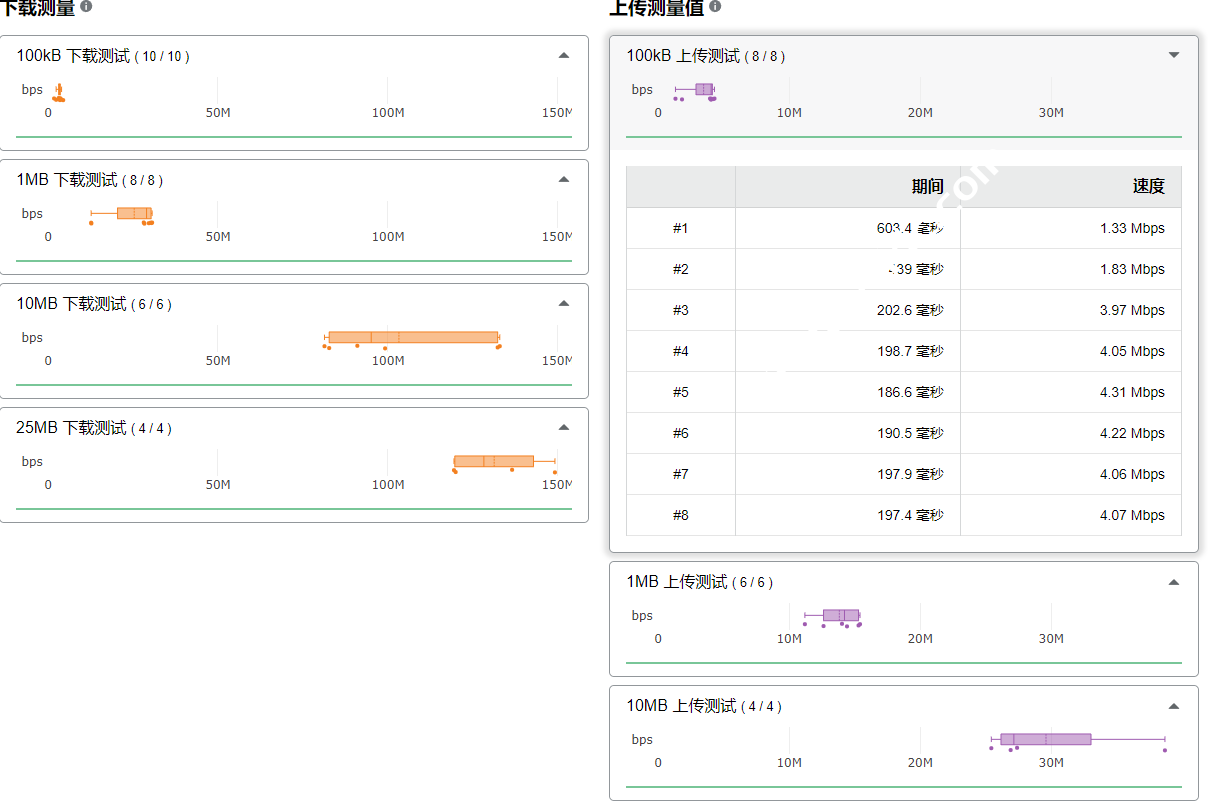 因为下载速度和上传速度结果类型一样,所以以下载速度为例,会包括多种大小文件的测试结果,包括 100kB、1MB、10MB 大小的文件的测试结果。