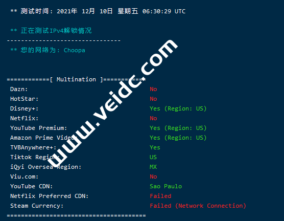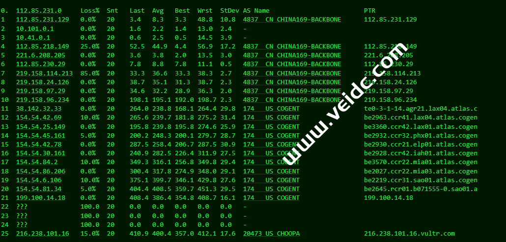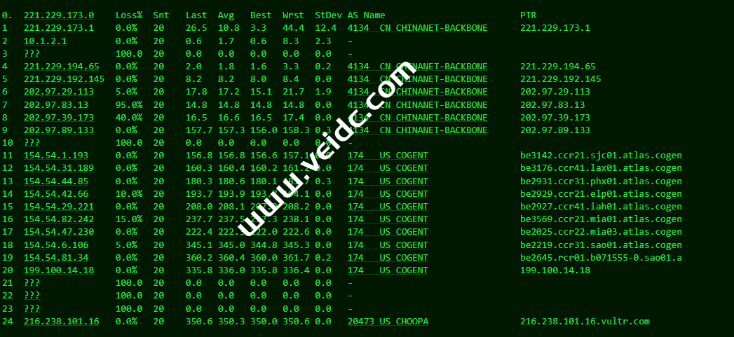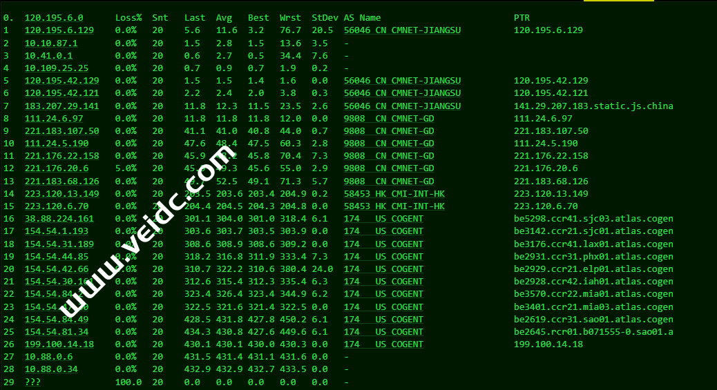 [Info] 测试路由 到 上海电信(天翼云) 中 ... traceroute to 101.227.255.45 (101.227.255.45), 30 hops max, 32 byte packets 1 * 2 * 3 * 4 * 5 * 6 199.100.14.17 1.44 ms AS174 巴西, 圣保罗州, 圣保罗, cogentco.com 7 be2645.ccr31.sao01.atlas.cogentco.com (154.54.81.33) 2.12 ms AS174 巴西, 圣保罗州, 圣保罗, cogentco.com 8 be2219.ccr22.mia03.atlas.cogentco.com (154.54.6.105) 113.24 ms AS174 美国, 佛罗里达州, 迈阿密, cogentco.com 9 be2025.ccr21.mia01.atlas.cogentco.com (154.54.47.229) 115.81 ms AS174 美国, 佛罗里达州, 迈阿密, cogentco.com 10 be3569.ccr41.iah01.atlas.cogentco.com (154.54.82.241) 142.10 ms AS174 美国, 德克萨斯州, 休斯顿, cogentco.com 11 be2927.ccr21.elp01.atlas.cogentco.com (154.54.29.222) 155.47 ms AS174 美国, 德克萨斯州, 埃尔帕索, cogentco.com 12 be2929.ccr31.phx01.atlas.cogentco.com (154.54.42.65) 166.02 ms AS174 美国, 亚利桑那州, 凤凰城, cogentco.com 13 be2931.ccr41.lax01.atlas.cogentco.com (154.54.44.86) 177.39 ms AS174 美国, 加利福尼亚州, 洛杉矶, cogentco.com 14 be3176.ccr21.sjc01.atlas.cogentco.com (154.54.31.190) 190.01 ms AS174 美国, 加利福尼亚州, 圣何塞, cogentco.com 15 be3142.ccr41.sjc03.atlas.cogentco.com (154.54.1.194) 188.00 ms AS174 美国, 加利福尼亚州, 圣何塞, cogentco.com 16 38.104.138.106 189.74 ms AS174 美国, 加利福尼亚州, 圣何塞, cogentco.com 17 202.97.52.249 315.96 ms AS4134 中国, 上海, chinatelecom.com.cn, 电信 18 * 19 202.97.24.193 318.35 ms AS4134 中国, 上海, chinatelecom.com.cn, 电信 20 61.152.26.5 373.92 ms AS4812 中国, 上海, chinatelecom.com.cn, 电信 21 101.95.207.18 321.64 ms AS4812 中国, 上海, chinatelecom.com.cn, 电信 22 * 23 * 24 * 25 * 26 * 27 * 28 * 29 * 30 * [Info] 测试路由 到 上海电信(天翼云) 完成 ! [Info] 测试路由 到 厦门电信CN2 中 ... traceroute to 117.28.254.129 (117.28.254.129), 30 hops max, 32 byte packets 1 * 2 * 3 * 4 * 5 * 6 199.100.14.17 1.60 ms AS174 巴西, 圣保罗州, 圣保罗, cogentco.com 7 be2645.ccr31.sao01.atlas.cogentco.com (154.54.81.33) 2.20 ms AS174 巴西, 圣保罗州, 圣保罗, cogentco.com 8 be2219.ccr22.mia03.atlas.cogentco.com (154.54.6.105) 113.26 ms AS174 美国, 佛罗里达州, 迈阿密, cogentco.com 9 * 10 ae-2-52.ear2.LosAngeles1.Level3.net (4.69.207.45) 163.05 ms AS3356 美国, 加利福尼亚州, 洛杉矶, level3.com 11 CHINA-TELEC.ear2.LosAngeles1.Level3.net (4.71.136.202) 176.98 ms AS3356 美国, 加利福尼亚州, 洛杉矶, level3.com 12 59.43.182.81 310.68 ms * 中国, 上海, chinatelecom.com.cn, 电信 13 59.43.187.57 316.56 ms * 中国, 上海, chinatelecom.com.cn, 电信 14 59.43.130.213 324.31 ms * 中国, 上海, chinatelecom.com.cn, 电信 15 59.43.138.186 344.34 ms * 中国, 福建, chinatelecom.com.cn, 电信 16 * 17 * 18 117.25.141.110 333.29 ms AS133775 中国, 福建, 厦门, chinatelecom.com.cn, 电信 19 117.28.254.129 349.06 ms AS4809 中国, 福建, 厦门, chinatelecom.com.cn, 电信 [Info] 测试路由 到 厦门电信CN2 完成 ! [Info] 测试路由 到 浙江杭州联通 中 ... traceroute to 101.71.241.238 (101.71.241.238), 30 hops max, 32 byte packets 1 * 2 * 3 * 4 * 5 * 6 * 7 * 8 ae12-617.sanpaolo8.spa.seabone.net (149.3.181.6) 111.95 ms AS6762 巴西, 圣保罗州, 圣保罗, tisparkle.com 9 * 10 219.158.40.49 174.38 ms AS4837 美国, 加利福尼亚州, 洛杉矶, chinaunicom.com, 联通 11 219.158.102.153 386.08 ms AS4837 中国, 北京, chinaunicom.com, 联通 12 219.158.16.65 388.45 ms AS4837 中国, 北京, chinaunicom.com, 联通 13 219.158.5.157 367.79 ms AS4837 中国, 北京, chinaunicom.com, 联通 14 219.158.99.6 398.02 ms AS4837 中国, 浙江, 杭州, chinaunicom.com, 联通 15 101.69.245.206 416.33 ms AS4837 中国, 浙江, 杭州, chinaunicom.com, 联通 16 * 17 * 18 * 19 * 20 * 21 * 22 * 23 * 24 * 25 * 26 * 27 * 28 * 29 * 30 * [Info] 测试路由 到 浙江杭州联通 完成 ! [Info] 测试路由 到 浙江杭州移动 中 ... traceroute to 112.17.0.106 (112.17.0.106), 30 hops max, 32 byte packets 1 * 2 * 3 * 4 * 5 * 6 199.100.14.17 1.24 ms AS174 巴西, 圣保罗州, 圣保罗, cogentco.com 7 be2645.ccr31.sao01.atlas.cogentco.com (154.54.81.33) 2.12 ms AS174 巴西, 圣保罗州, 圣保罗, cogentco.com 8 be2219.ccr22.mia03.atlas.cogentco.com (154.54.6.105) 113.53 ms AS174 美国, 佛罗里达州, 迈阿密, cogentco.com 9 be2027.ccr22.mia01.atlas.cogentco.com (154.54.86.205) 115.40 ms AS174 美国, 佛罗里达州, 迈阿密, cogentco.com 10 be3570.ccr42.iah01.atlas.cogentco.com (154.54.84.1) 141.89 ms AS174 美国, 德克萨斯州, 休斯顿, cogentco.com 11 be2928.ccr21.elp01.atlas.cogentco.com (154.54.30.162) 207.81 ms AS174 美国, 德克萨斯州, 埃尔帕索, cogentco.com 12 be2929.ccr31.phx01.atlas.cogentco.com (154.54.42.65) 166.01 ms AS174 美国, 亚利桑那州, 凤凰城, cogentco.com 13 be2931.ccr41.lax01.atlas.cogentco.com (154.54.44.86) 177.75 ms AS174 美国, 加利福尼亚州, 洛杉矶, cogentco.com 14 be3243.ccr41.lax05.atlas.cogentco.com (154.54.27.118) 177.65 ms AS174 美国, 加利福尼亚州, 洛杉矶, cogentco.com 15 38.104.85.162 289.81 ms AS174 美国, 加利福尼亚州, 洛杉矶, cogentco.com 16 223.120.6.217 279.93 ms AS58453 美国, 加利福尼亚州, 洛杉矶, chinamobile.com, 移动 17 223.120.6.125 274.21 ms AS58453 美国, 加利福尼亚州, 洛杉矶, chinamobile.com, 移动 18 223.120.13.46 492.93 ms AS58453 中国, 上海, chinamobile.com, 移动 19 * 20 * 21 * 22 111.24.3.89 491.46 ms AS9808 中国, 上海, chinamobile.com, 移动 23 221.183.108.122 476.93 ms AS9808 中国, 浙江, 杭州, chinamobile.com, 移动 24 * 25 * 26 * 27 * 28 * 29 * 30 * [Info] 测试路由 到 浙江杭州移动 完成 ! [Info] 测试路由 到 北京教育网 中 ... traceroute to 202.205.6.30 (202.205.6.30), 30 hops max, 32 byte packets 1 * 2 * 3 * 4 * 5 * 6 199.100.14.17 1.23 ms AS174 巴西, 圣保罗州, 圣保罗, cogentco.com 7 be2645.ccr31.sao01.atlas.cogentco.c