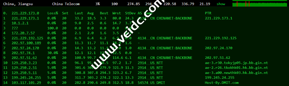 Traceroute to China, Guangzhou CT (TCP Mode, Max 30 Hop) ============================================================ traceroute to 113.108.209.1 (113.108.209.1), 30 hops max, 32 byte packets 1 193.41.248.8 1.03 ms AS54574 United States, California, Los Angeles, dmit.io 2 * 3 129.250.5.10 1.03 ms AS2914 ntt.com 4 129.250.2.50 43.87 ms AS2914 Japan, Tokyo, ntt.com 5 129.250.5.78 157.40 ms AS2914 United States, California, San Jose, ntt.com 6 129.250.3.163 149.82 ms AS2914 ntt.com 7 129.250.9.74 151.78 ms AS2914 United States, California, San Jose, ntt.com 8 202.97.63.29 213.98 ms AS4134 China, Guangdong, Guangzhou, ChinaTelecom 9 202.97.91.193 207.73 ms AS4134 China, Guangdong, Guangzhou, ChinaTelecom 10 202.97.91.149 215.25 ms AS4134 China, Guangdong, Guangzhou, ChinaTelecom 11 113.96.4.46 218.33 ms AS4134 China, Guangdong, Guangzhou, ChinaTelecom 12 113.108.209.1 208.51 ms AS4134 China, Guangdong, Guangzhou, ChinaTelecom Traceroute to China, Shanghai CT (TCP Mode, Max 30 Hop) ============================================================ traceroute to 180.153.28.5 (180.153.28.5), 30 hops max, 32 byte packets 1 193.41.248.8 0.87 ms AS54574 United States, California, Los Angeles, dmit.io 2 * 3 129.250.5.70 2.16 ms AS2914 ntt.com 4 129.250.7.66 37.63 ms AS2914 Singapore, ntt.com 5 129.250.2.74 41.68 ms AS2914 Singapore, ntt.com 6 183.91.56.121 265.40 ms AS4134 Singapore, ChinaTelecom 7 202.97.93.157 285.69 ms AS4134 China, Shanghai, ChinaTelecom 8 202.97.12.181 305.84 ms AS4134 China, Shanghai, ChinaTelecom 9 202.97.57.26 285.81 ms AS4134 China, Shanghai, ChinaTelecom 10 61.152.24.245 256.69 ms AS4812 China, Shanghai, ChinaTelecom 11 101.95.207.2 267.98 ms AS4812 China, Shanghai, ChinaTelecom 12 124.74.232.62 298.91 ms AS4811 China, Shanghai, ChinaTelecom 13 101.227.255.46 289.02 ms AS4812 China, Shanghai, ChinaTelecom 14 180.153.28.5 295.09 ms AS4812 China, Shanghai, ChinaTelecom Traceroute to China, Beijing CT (TCP Mode, Max 30 Hop) ============================================================ traceroute to 180.149.128.9 (180.149.128.9), 30 hops max, 32 byte packets 1 193.41.248.8 0.25 ms AS54574 United States, California, Los Angeles, dmit.io 2 * 3 129.250.5.70 2.69 ms AS2914 ntt.com 4 129.250.7.66 38.94 ms AS2914 Singapore, ntt.com 5 129.250.2.74 43.02 ms AS2914 Singapore, ntt.com 6 183.91.56.125 273.14 ms AS4134 Singapore, ChinaTelecom 7 * 8 202.97.12.181 311.62 ms AS4134 China, Shanghai, ChinaTelecom 9 202.97.61.85 303.51 ms AS4134 China, Shanghai, ChinaTelecom 10 202.97.33.97 325.17 ms AS4134 China, Beijing, ChinaTelecom 11 * 12 36.110.248.254 327.06 ms AS23724 China, Beijing, ChinaTelecom 13 180.149.128.9 297.09 ms AS23724 China, Beijing, ChinaTelecom