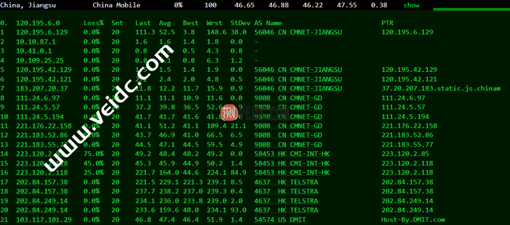 移动回程,直连走香港NTT回到内地。