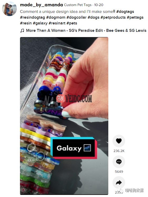 最近一款TikTok上定制化狗牌也引起了国外宠主热议,嘀嗒狗数据获取到TikTok平台博主@made by amanda专门为他人定制个性化宠物标签,目前粉丝数量为5.8万,作品获赞数近90万。