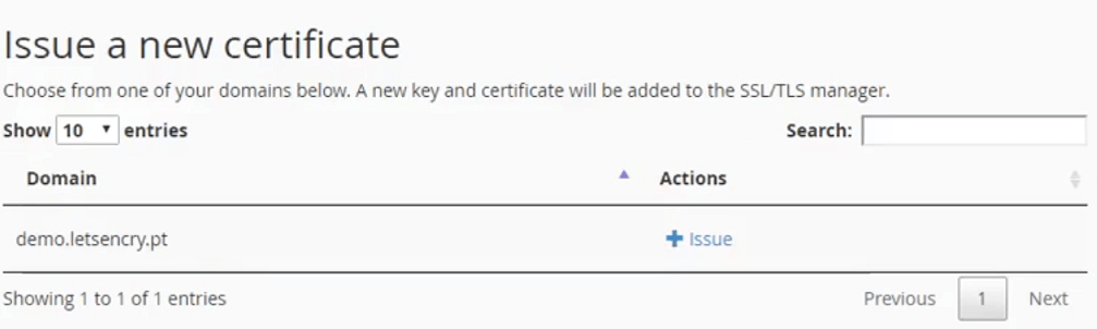 状态列将显示系统上证书的当前状态。如果出于任何原因,证书已从SSL / TLS管理器中删除而未从Let’s Encrypt™插件页面中删除,则此状态列将显示“已卸载”。