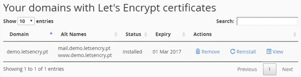 第一部分将列出所有已颁发“Let’s Encrypt™”证书的域名,其到期日期以及删除,重新安装和查看它们的选项: