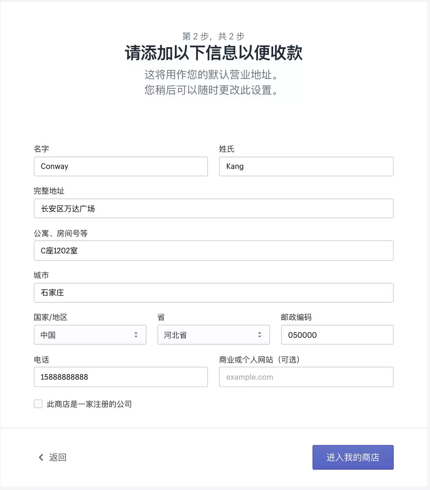 但是,作为新手,首先要明白的一点是,这个地址在我们的账户后台是随时可以修改的。也就是说我这里提交的是中国的地址,那我在账户注册下来之后,是可以随时把地址改成其他任意国家的地址的。因为现阶段我们只是要顺利的注册下来Shopify账户,因此,如实填写就可以了,至于后面究竟要不要把地址写成其他国家,相信跟着我们的教程,在Shopify独立站收款系列教程里,你会找到你要的答案的。这里就不赘述了,一个原则,如实填写就可以,写中文的或者英文的,或者拼音的,都可以,没有任何问题。