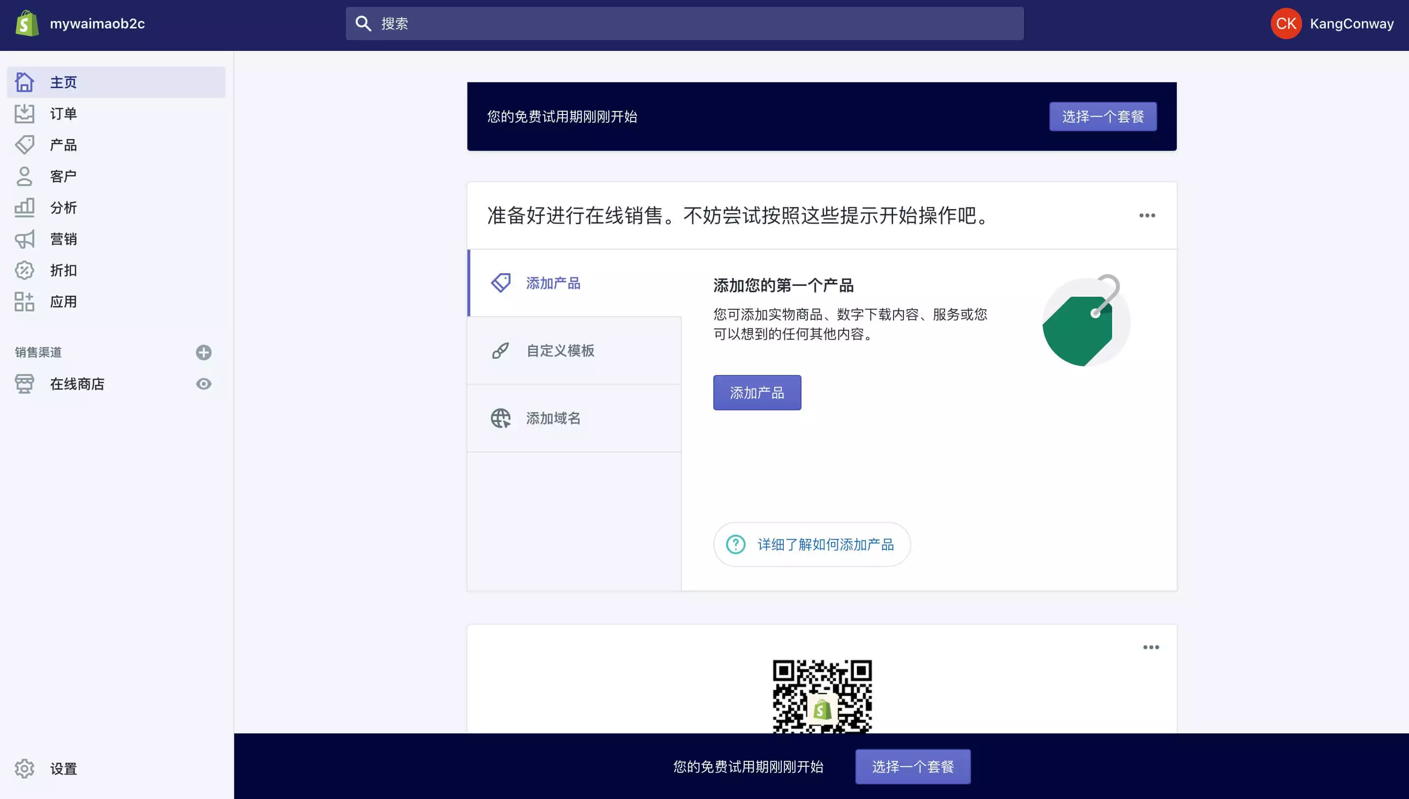 点击“开启套餐”按钮,则Shopify会按照你的选择完成套餐功能的开通,在网站后台,也找不到之前显示在页面顶部和底部的“选择一个套餐”的按钮了。到这里,我们就完成了Shopify套餐的选择和费用的支付。