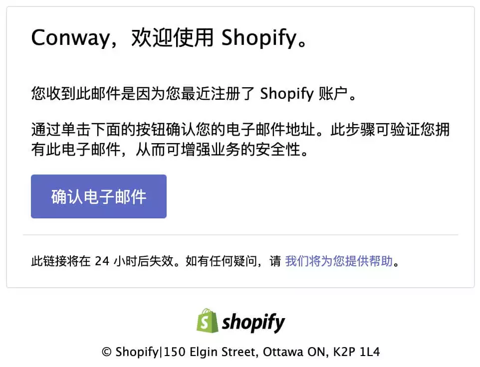 这个时候,在你的注册邮箱里面会收到Shopify给你发送的一封验证邮箱地址的邮件。如下图。我们需要点击邮件里面的“确认电子邮件”按钮,完成邮箱和Shopify账户验证,保障Shopify账户安全。