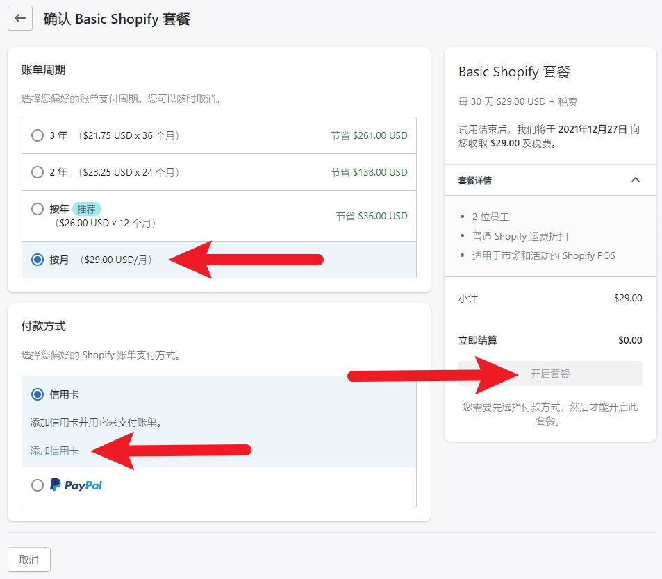 选择Shopify套餐账单周期并绑卡激活账户