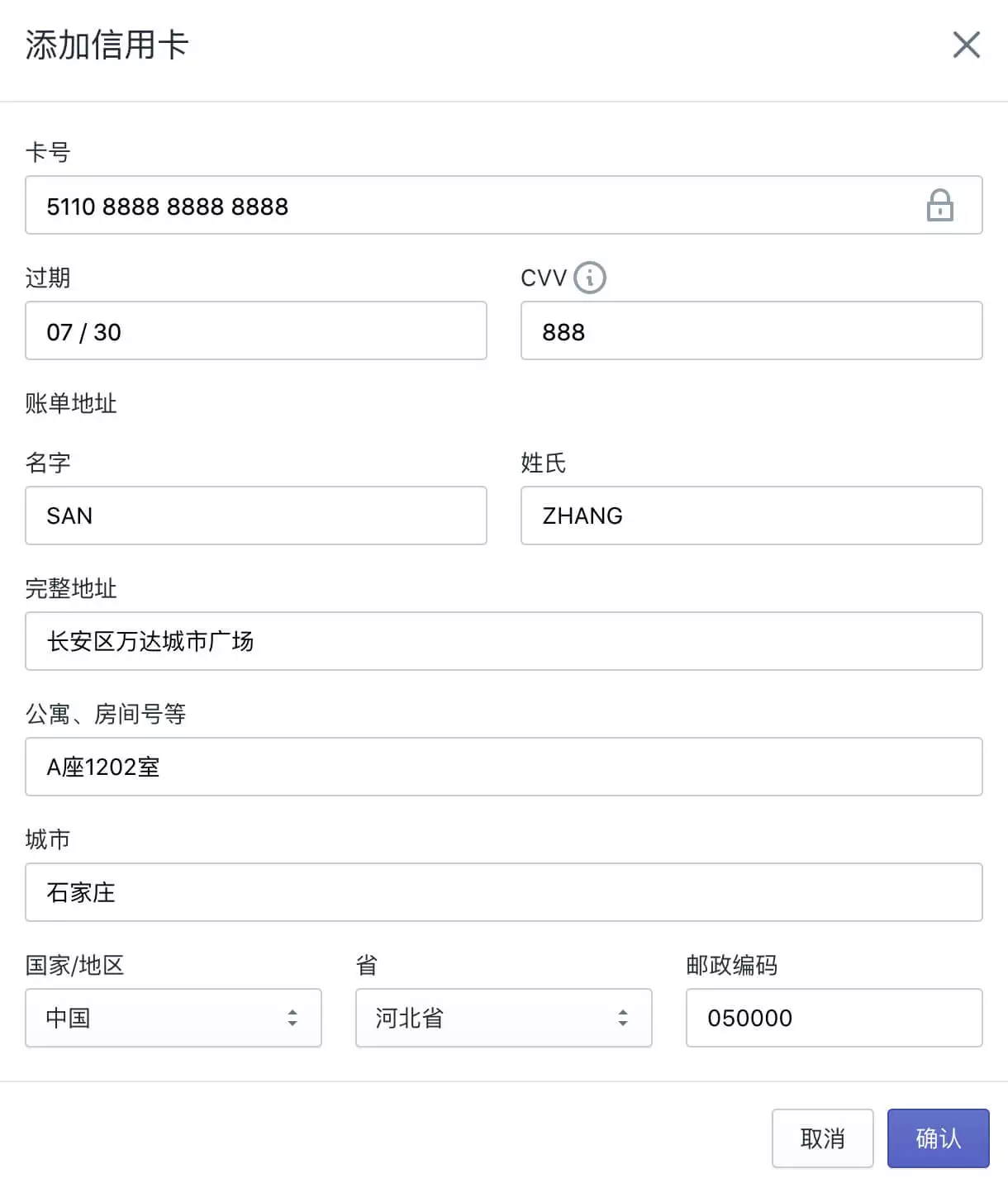 我先选择使用信用卡,点击信用卡选项下方的“添加信用卡”链接,在弹出窗口中输入你的信用卡信息。。卡号,过期日期,CVV按照你的卡片上的信息填写提交就可以。账单地址信息中的姓名,地址,城市,国家,邮编等等信息如实填写,中文,英文,拼音都可以。这个信息只是Shopify在扣款的时候会用到,客户不会看到你所提交的地址信息。