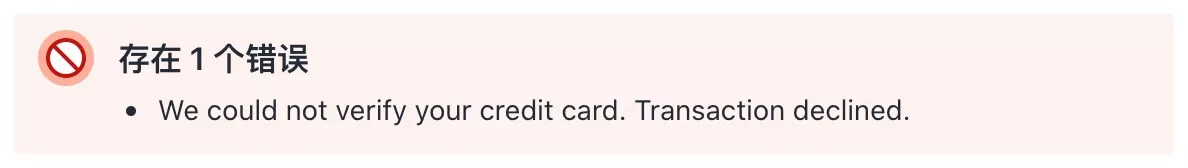 如果信用卡信息填写有误的话,就会出现如下所示的提示,请重新检查所填写的内容是否正确,尤其是卡号,过期日期,CVV是不能有任何错误,否则无法支付成功。