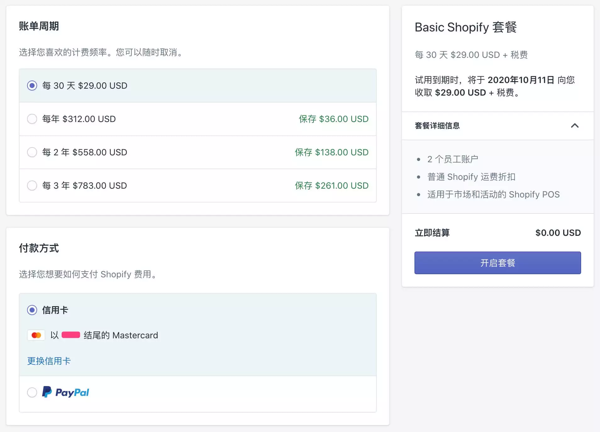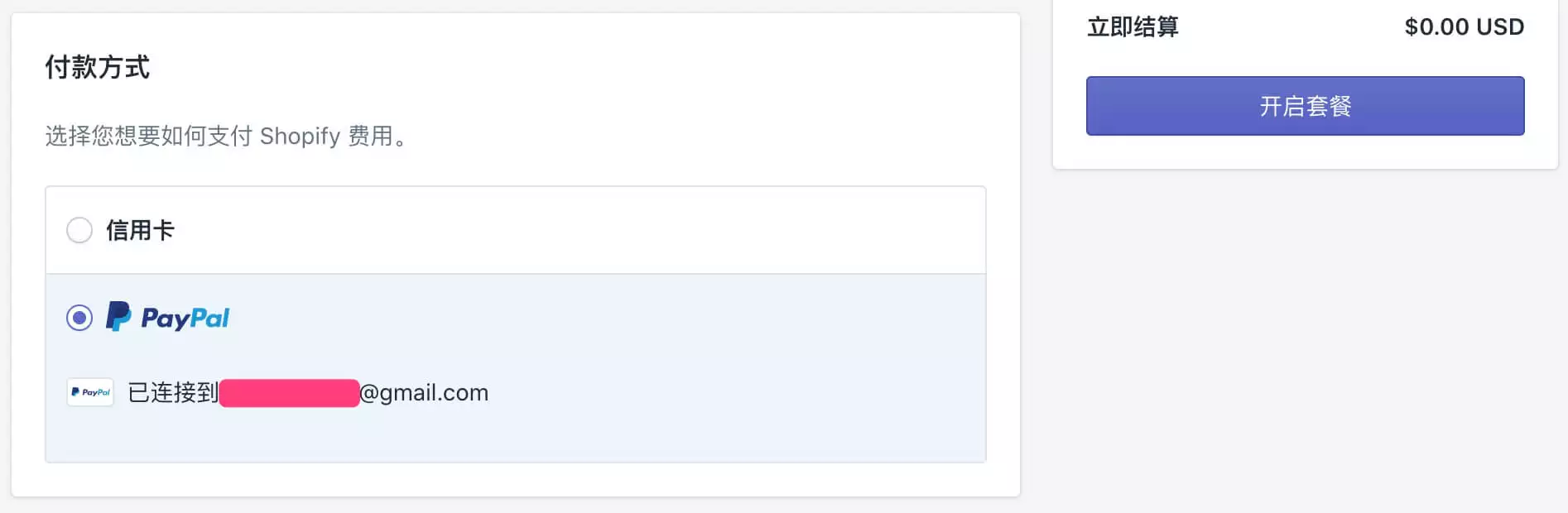 成功绑定信用卡之后,就可以选择通过信用卡来支付Shopify的套餐,在页面右侧显示“立即结算”的金额为0美金,也就是说,你现在点击“开启套餐”按钮之后,Shopify不会立即从你的信用卡扣钱,而是在等到14天试用期结束的时候,才会自动从你的信用卡中扣除套餐费用。