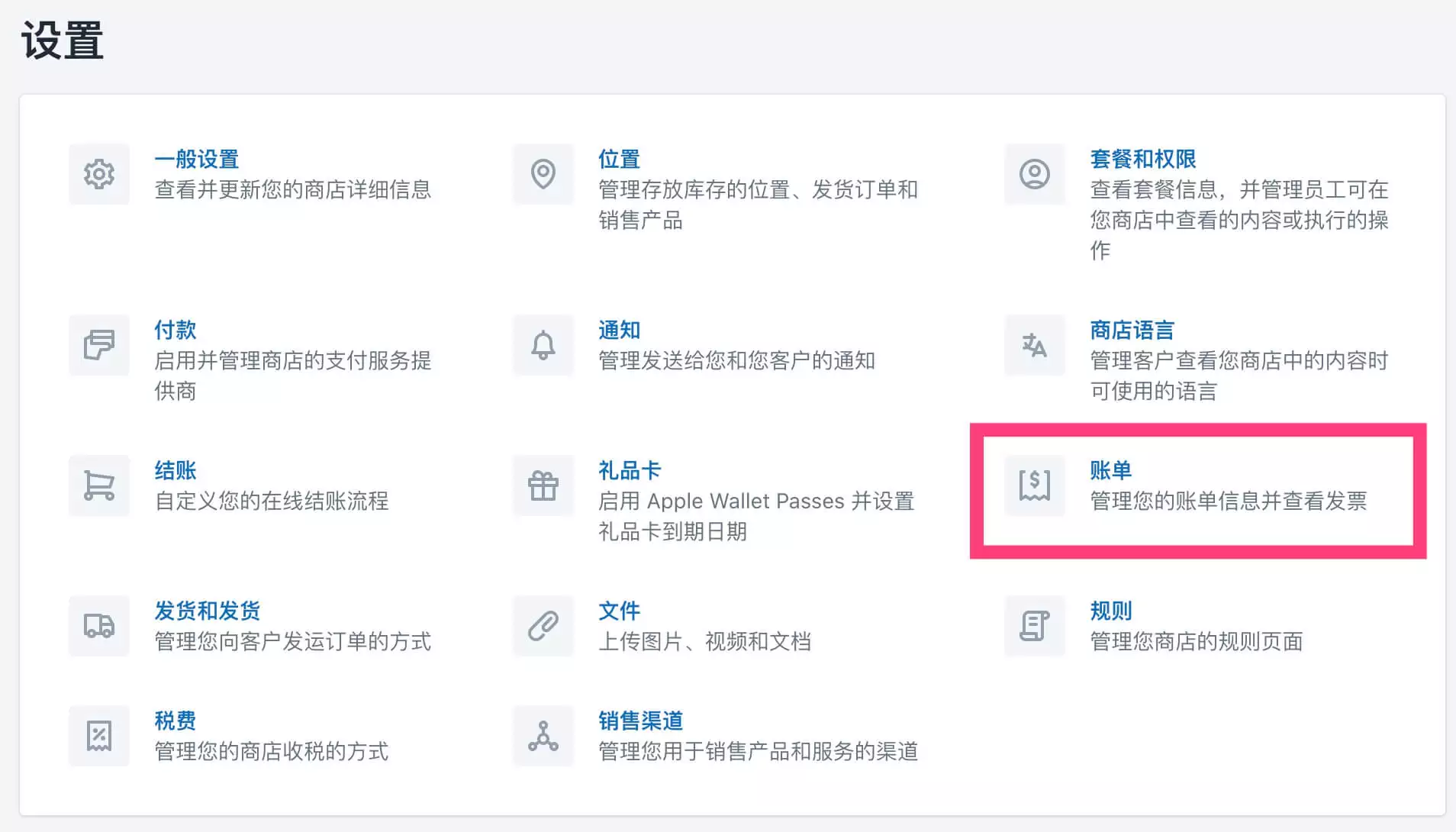 Shopify支持使用PayPal或者使用信用卡来缴纳月租,你在后台也是可以随时切换支付方式的。上面我们使用信用卡支付的月租,如果后面我们想使用PayPal支付月租,那么,请点击网站后台左下角的“设置”按钮,然后点击“账单”设置,如下图
