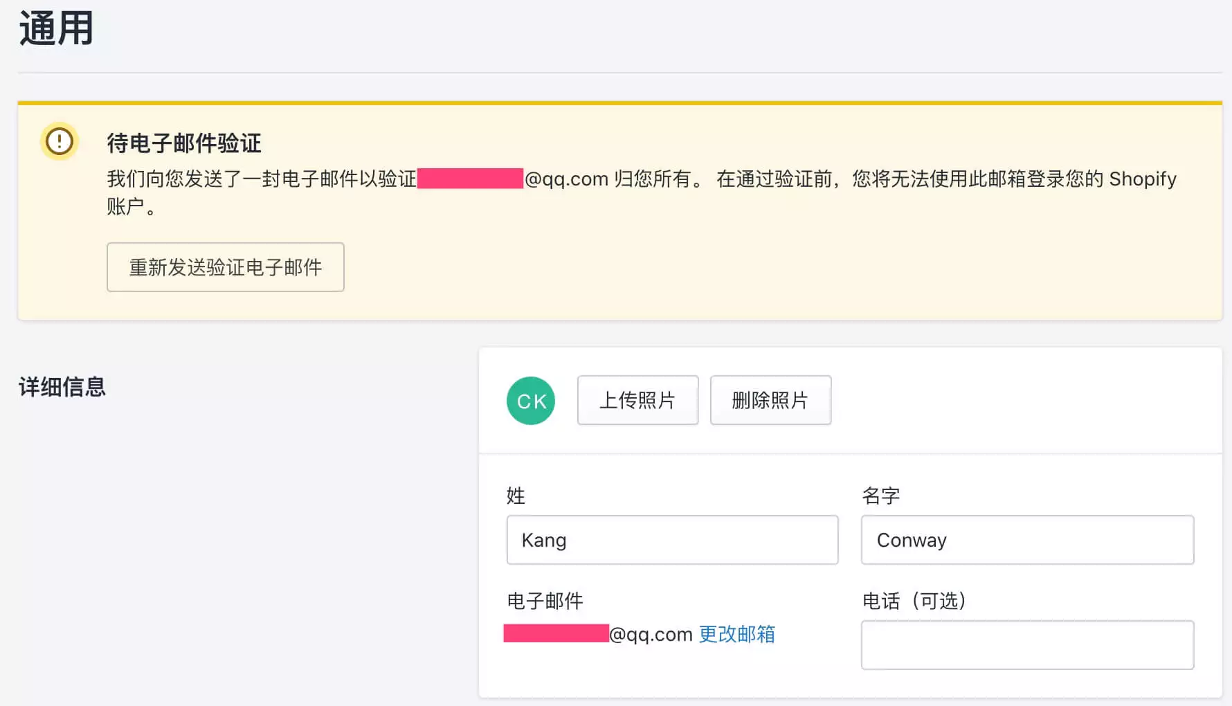然后在通用设置页面,详细信息版块,你可以修改电子邮件地址,这个邮箱地址就是你的Shopify店铺的登录邮箱地址。如果在这个页面和下图一样显示“待电子邮件验证”,请尽快验证你的邮箱地址,如果你没有收到验证邮件,可以点击“重新发送验证电子邮件”按钮重新获取邮件。