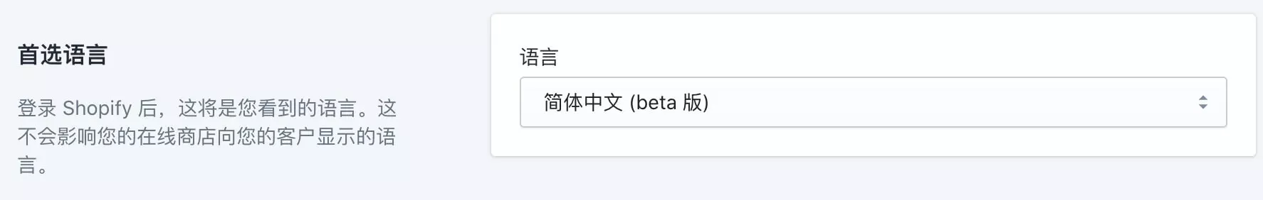 目前Shopify提供了包括中文后台在内的十几种后台语种,你可以在后台随时切换语言,后台语言和前台语言没有任何关系,所以,即使你的网站后台是中文的,网站前台也还是英文的,或者其他你设置的语种的。
