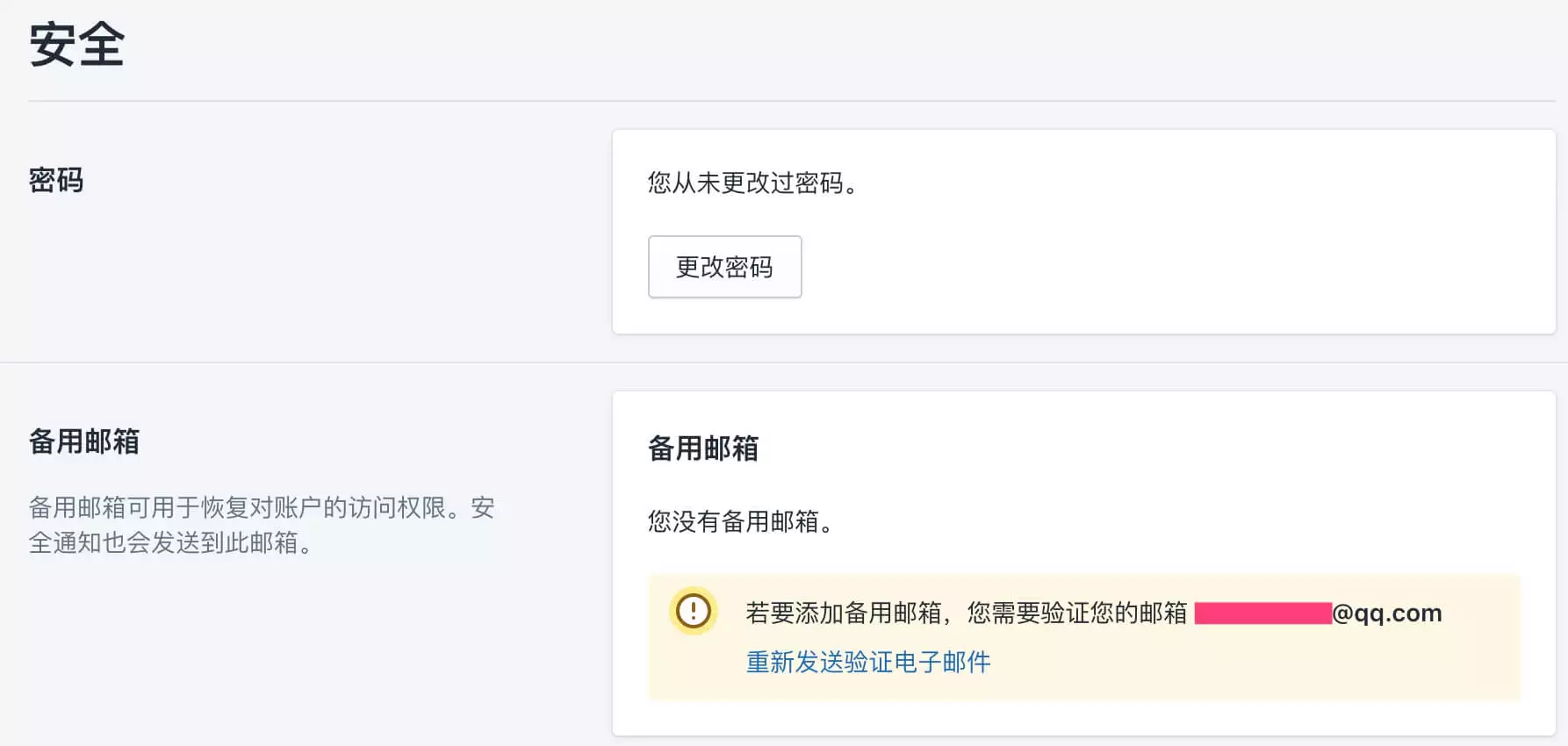 在安全页面,可以点击更改密码,来修改你的Shopify店铺登录密码。也可以在这里添加备用邮箱,防止因为忘记登录密码,同时你的主要邮箱无法接受密码重置邮件,导致你无法登录Shopify网站的后台的情况发生。