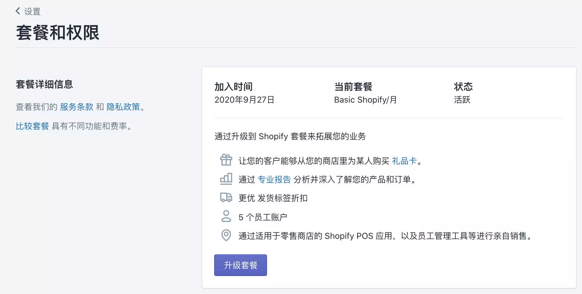 我们在之前选择的是29美金每月的套餐,你可以随时升级或者降级你的套餐,在Shopify后台,左下角点击“设置”,然后选择“套餐和权限”,在这里,你可以点击“升级套餐”按钮将你的Shopify账户从29美金每月的“Basic Shopify”套餐升级到79美金每月的“Shopify”套餐。