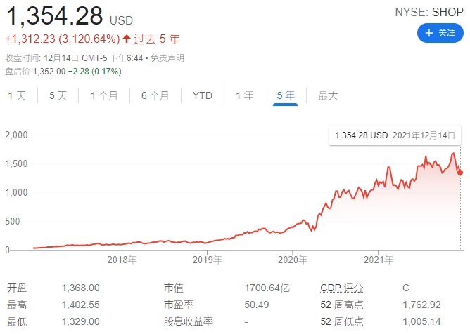 Shopify的股价自上市之后也是一路飙升,我是2018年上车的,当时因为有些美金回不来,闲着也是闲着,就以126.29美金每股的价格买了些Shopify股票。过去5年,Shopify的股票翻了30多倍,单从投入产出比看,买Shopify的股票赚钱,可比用Shopify打FB广告卖货来的轻松。